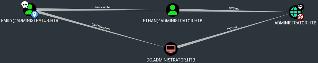 En fouillant, on voit que l’utilisateur Ethan a le privilège DCSync sur le domaine, et qu’Emily dispose de GenericWrite sur Ethan.