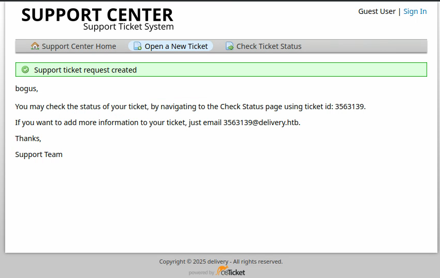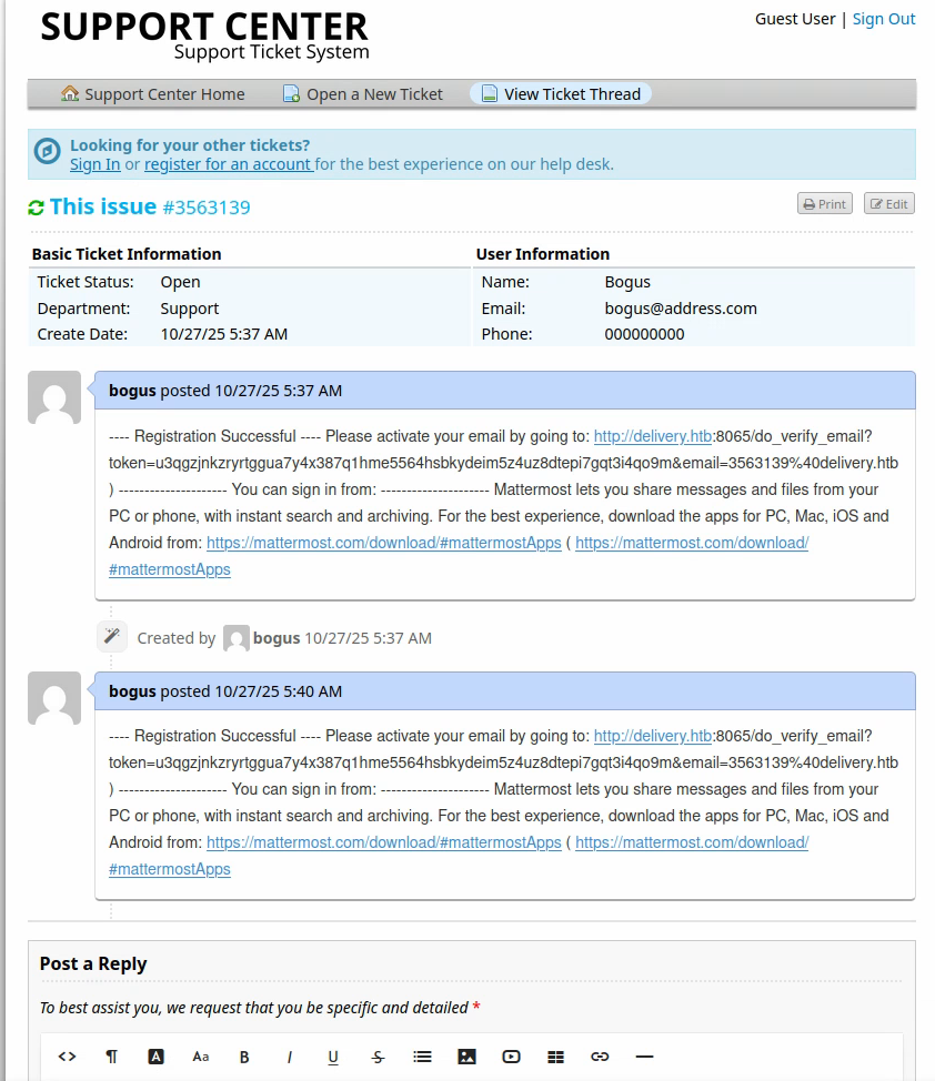 Les identifiants que j’ai entrés sont : u3563139:Uu35631393563139! et dès que je clique sur « Create Account », ça envoie un e-mail à l’adresse : 356139@delivery.htb. On découvre alors que tout mail envoyé à cette adresse (qui a été créée pour gérer le ticket que j’ai ouvert en tant que Bogus) apparaît ensuite dans le fil de discussion du statut du ticket.