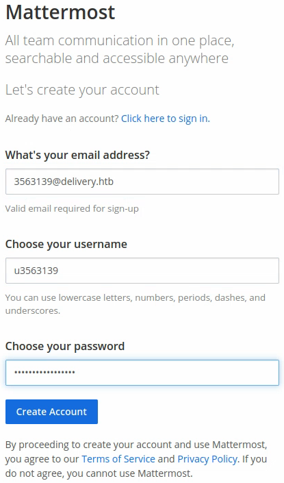 On pourrait peut-être réutiliser cette adresse en @delivery.htb pour d’autres usages. Essayons de nous enregistrer sur Mattermost avec :