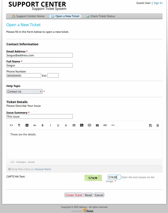 Tentons de créer un ticket sur osTicket et voyons ce qu’il se passe, j’utiliserai le nom d’utilisateur bogus :