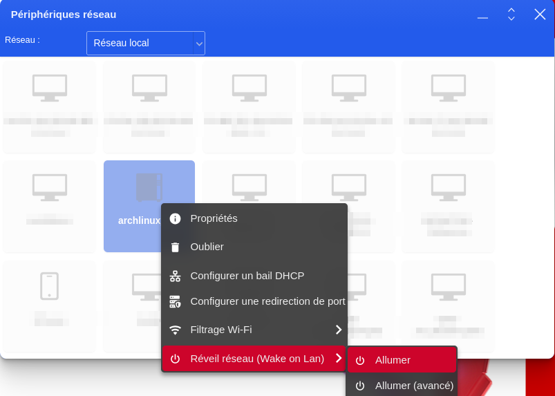 Je l’ai renommé archlinux_eth et j’ai changé le logo pour le repérer plus rapidement. On peut faire un clique droit dessus et envoyer le paquet d’allumage :
