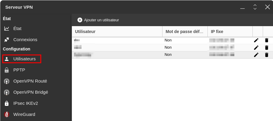 On ajoute notre utilisateur avec le type de connexion (Wireguard) :