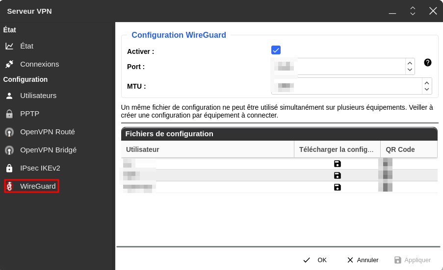 Ensuite on navigue sur Wireguard dans le menu Wireguard pour télécharger le fichier de configuration :